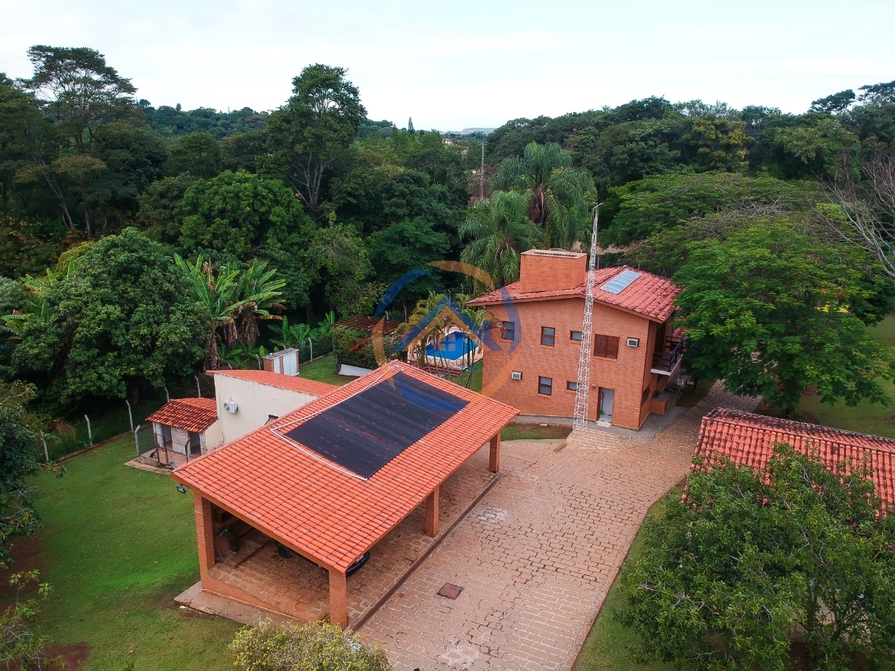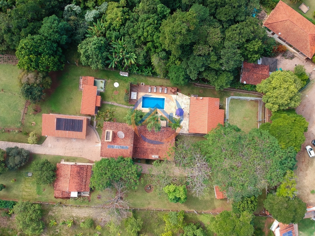 Casa principal possui sala de estar com lareira, sala de TV com barzinho, sala de jantar, cozinha com armários planejados, despensa, 2 dormitórios com ar condicionado e armários planejados, banheiro, roupeiro e escritório.